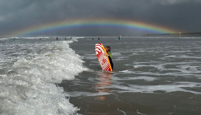 the tumultuous clouds like salt and pepper, on/off drizzle – the opportunity and get out in the sea wasn’t tempting. but always go! the sun came out, the white horses shone, and a rainbow framed the scene.